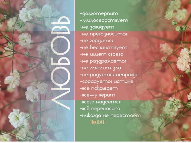 Наверно всю жизнь нам придётся сравнивать свою любовь с эталоном Божьей любви, чтобы как можно больше была похожа наша любовь на Отцовскую. Комментарий автора: Однажды Господь побудил меня протестироваться по всем пунктам Его любви. Я застопорилась уже на первом:(((. Любовь долготерпит...